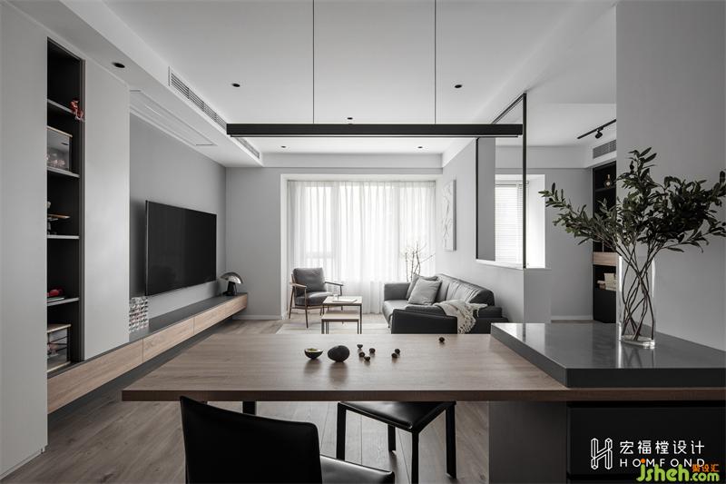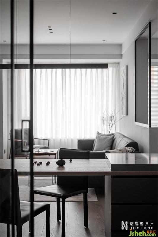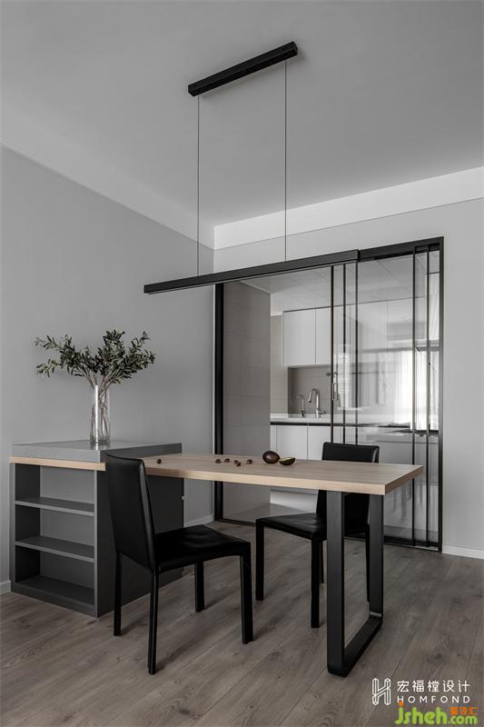 餐桌设计为屋主喜欢的岛台形式,利用石材与木质桌板完美协调在一起。再深入研究他们的生活习惯,将石材部分设计为开放式放置水杯+隐藏式储物两种形式。