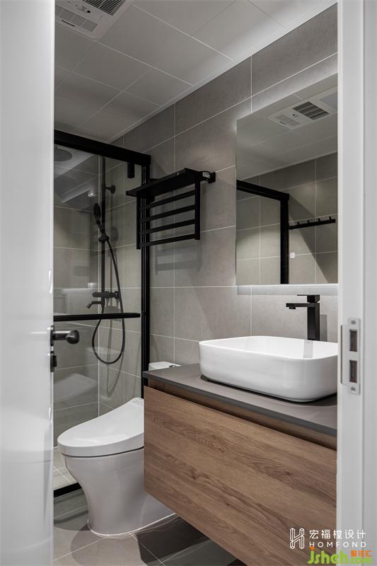 卫生间使用哑光系列的材质来表达空间质感,龙头、毛巾架、花洒选择黑色铜质,和浴室柜门淳朴的木质原色形成很好的契合度。