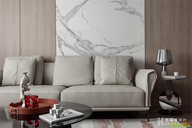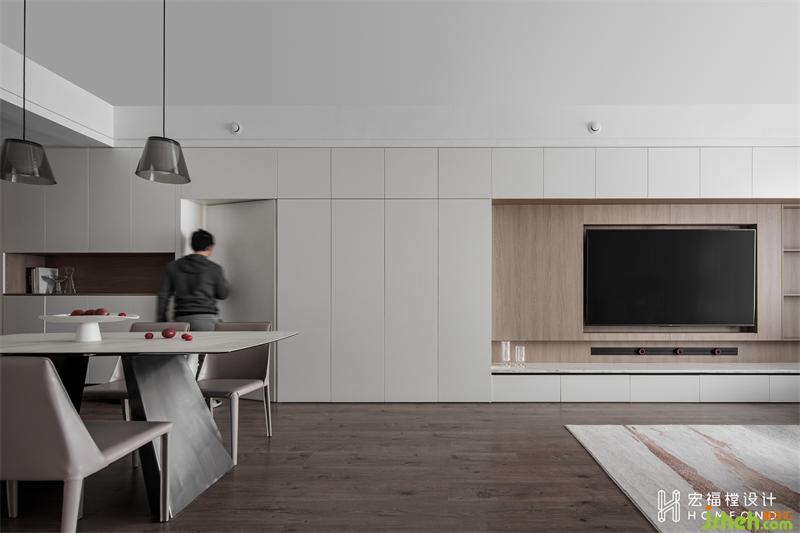 在办公环境多元化的时代,其实生活习惯也在慢慢发生着改变。将原始电视墙与沙发墙位置调换,改变主卧、书房一侧的生活动线,利用总长9575mm的柜体,将玄关、电视墙联为一面,而将书房、主卧藏于其中,赋予空间更多的趣味意义。