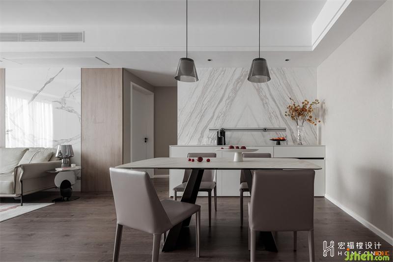 高层19楼,从大大的窗户照射进来的光线令人心情舒畅。因为小孩刚满两周岁,所以将地板、墙面、吊顶更换为更为环保的材质。重塑之后的简洁硬朗线条、玻璃、皮质、岩板、木饰面,不同的自然材质及颜色赋予客厅空间更错落的层次感。