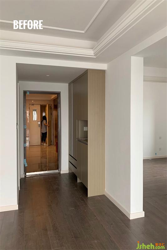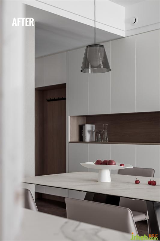 因原玄关储物空间不足,我们彻底更换原始风格,重新设计为总长度2705mm的换鞋+储物区。以亮白色系搭配木色进行呈现,从进门开始,归喧嚣于静止,打造怡然、沉浸的优雅质感。