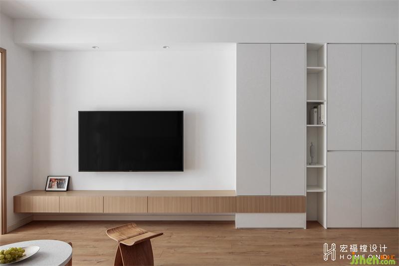 沿进门右侧墙壁设计900mm+2540mm的玄关区域,并与电视墙连为一体,在视觉效果上拉长整个房间的同时为出入居所增添仪式感。