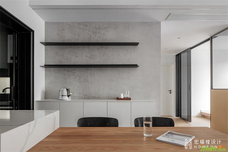 在面积不够宽裕的空间中,岛台餐厅能够更好的平衡空间之间的关系。大理石台面+木质餐面长度2200mm,宽度750mm,满足家人用餐的同时,两边过道也不显拥挤。西厨墙面铺贴灰水泥质感墙纸,与白墙对比出空间层次。