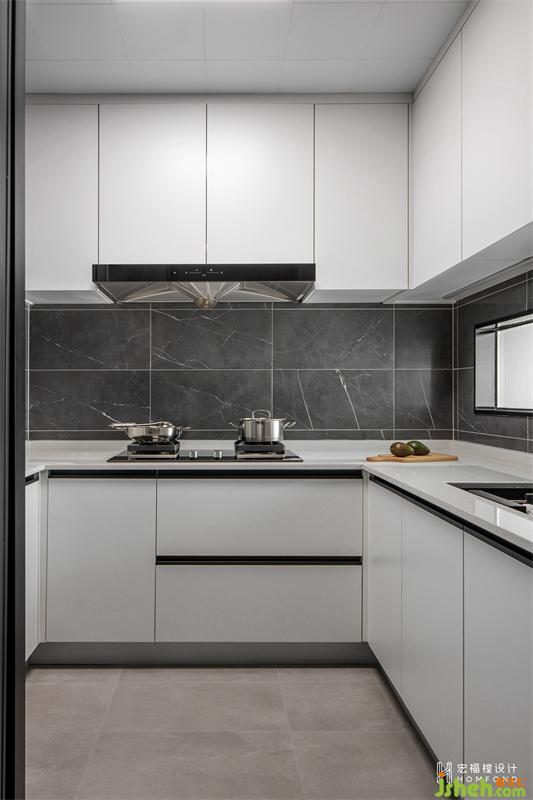 厨房在够用的基础上将阳台部分划分给卫生间使用,因空间中没有自然光源,所以我们将与卫生间紧邻的隔墙改造为长虹玻璃材质,既可以将外部光线引入厨房,又不会干扰卫生间的隐私性。
