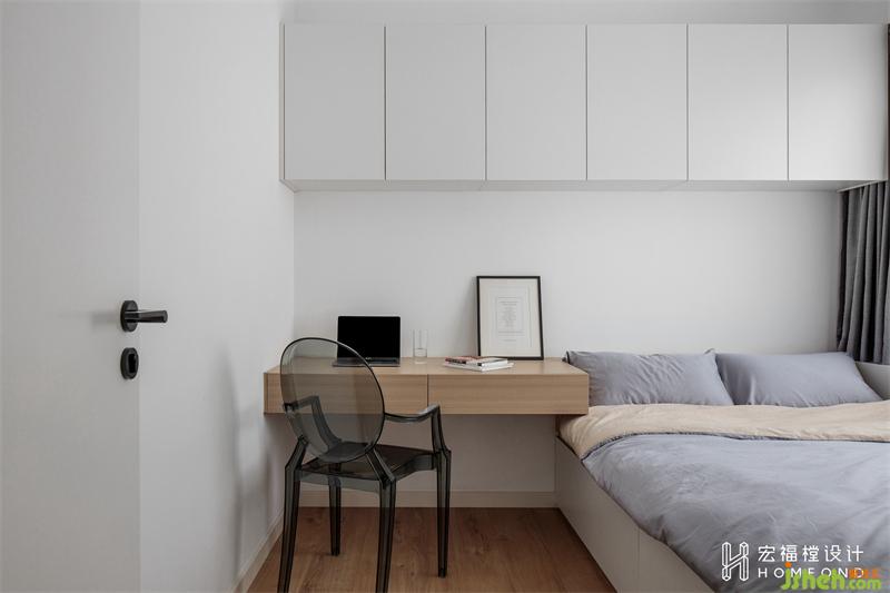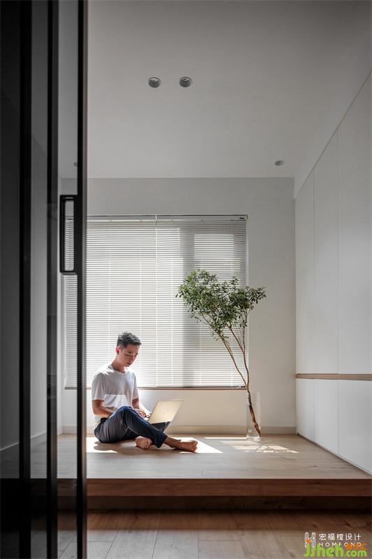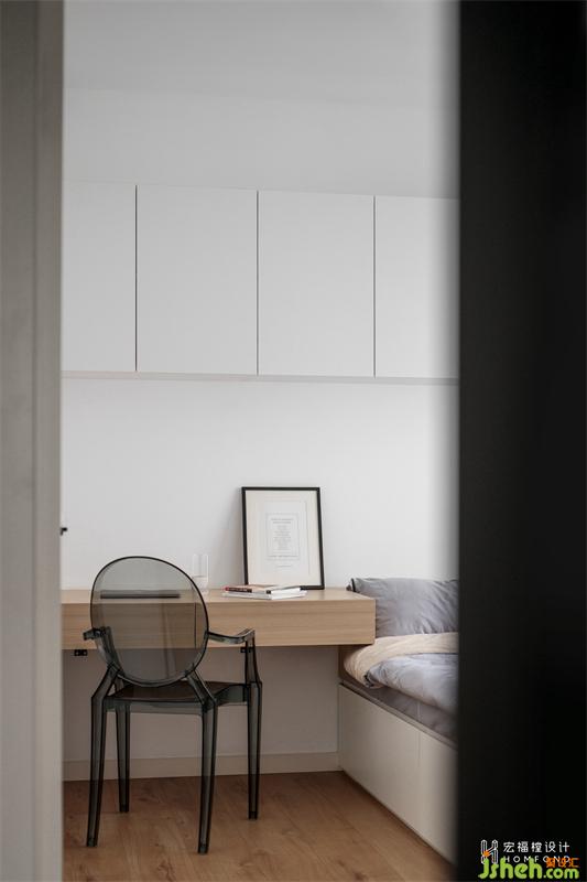 将地面抬高180mm,以简易榻榻米的形式呈现,在视觉上增强空间层次感。右侧为1400mmx500mm的整面隐形储物柜。书房空间的多元功能性里同时容纳了储物、朋友聚会聊天、办公、小孩玩乐区。