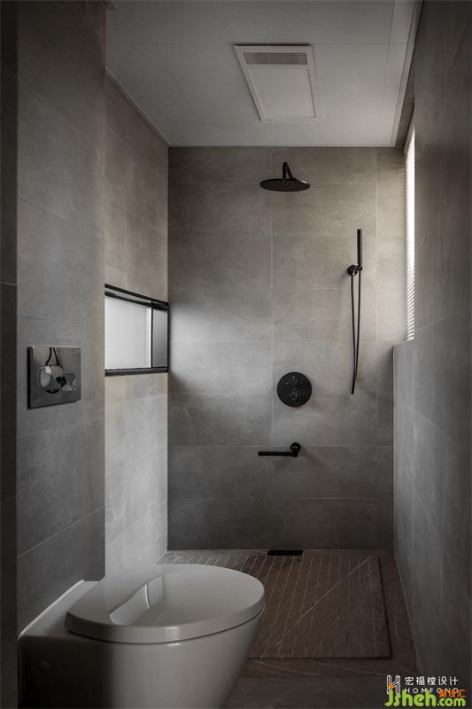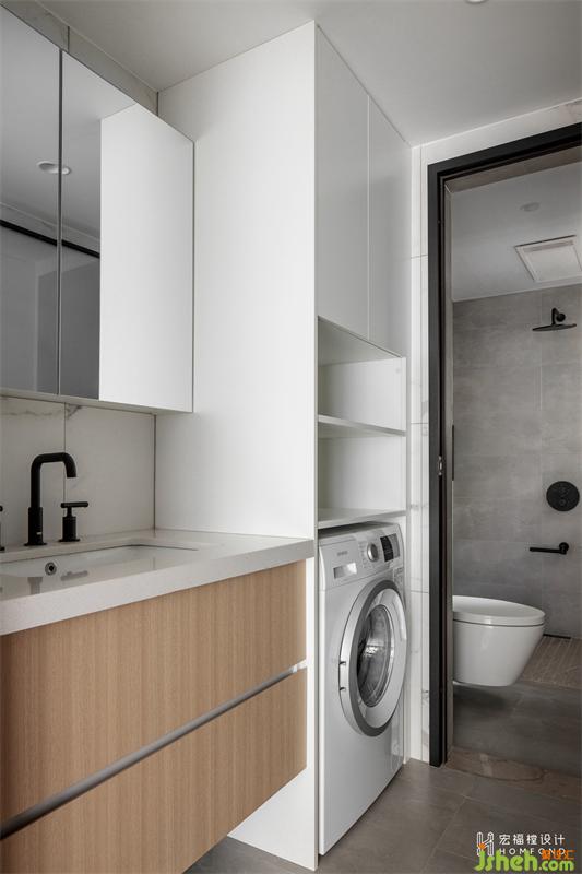 厨房阳台并入卫生间使用后,洗漱、入厕、洗衣,每个区域独立且动线清晰顺畅。因公共空间“打开”,开放式书房充沛的光线也因此引入了卫生间区域。