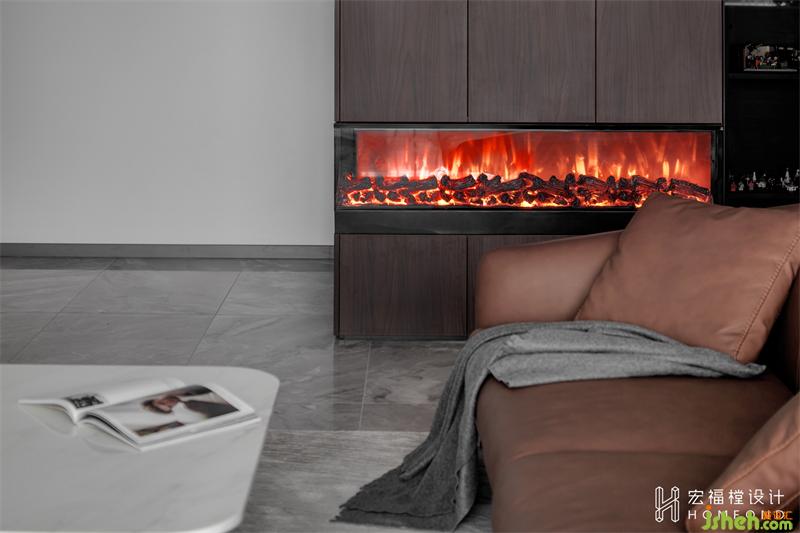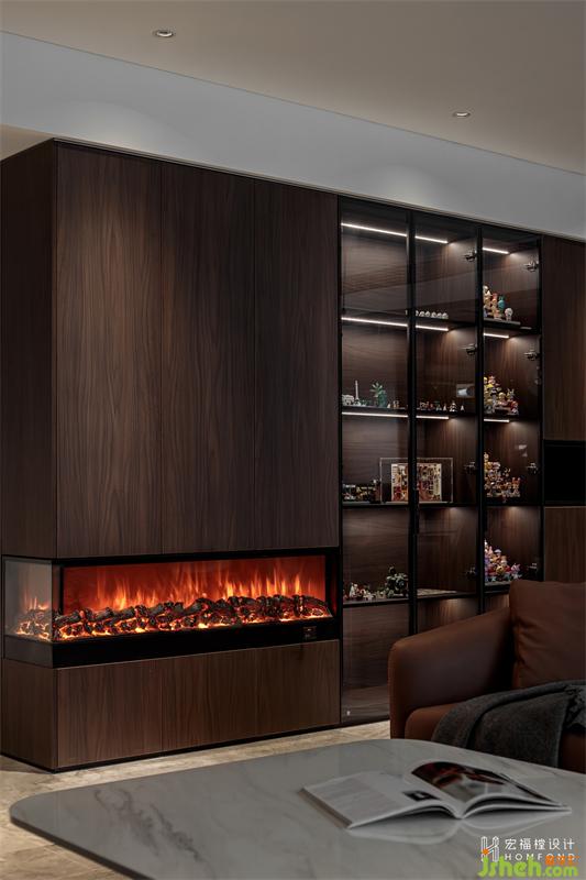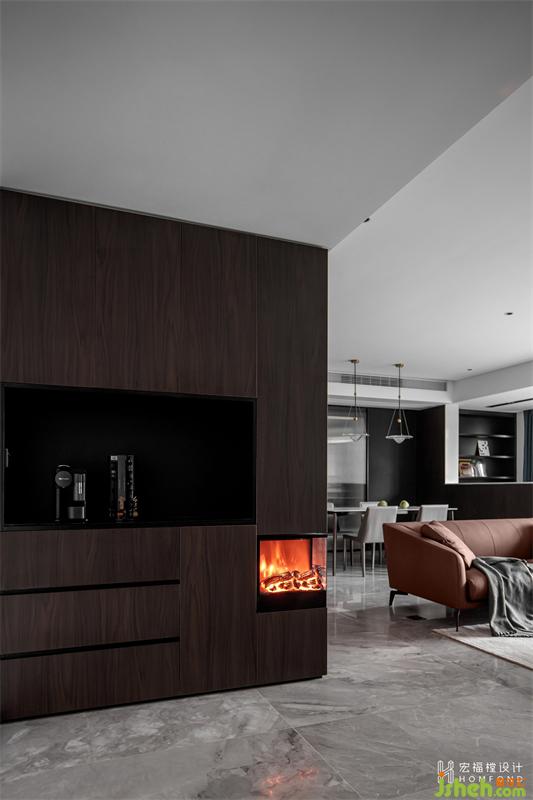 定制的电子仿真壁炉,除中和冷调,让居家氛围更温馨外,还有风口为空间输送暖气。L型柜体挨着走廊的方向我们将其中间位置设计为1200mmx600mmx400mm(长、宽、深度)的开放式储物形式,可放置屋主购买的家用咖啡机及一些常用水杯,下方则是抽屉柜,用于放置咖啡粉、果汁等食品类生活物品,使用起来非常方便。