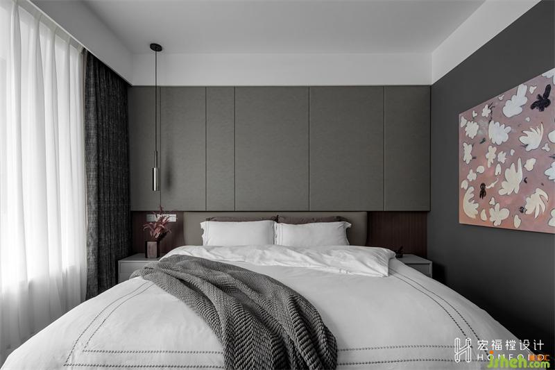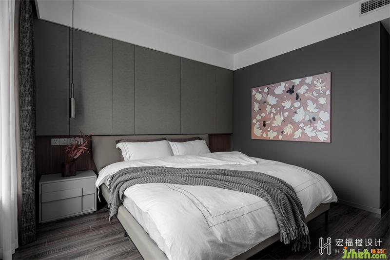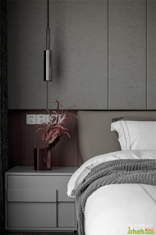 主卧由于收纳空间不足,所以调整了卫生间与卧室之间的距离,设计为1820mmx1670mm的L型衣帽间。整体风格去掉过于硬朗的黑色,延续灰调,搭配柔和的粉色,氛围兼具优雅与浪漫,打造别样梦境。