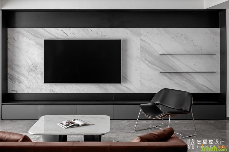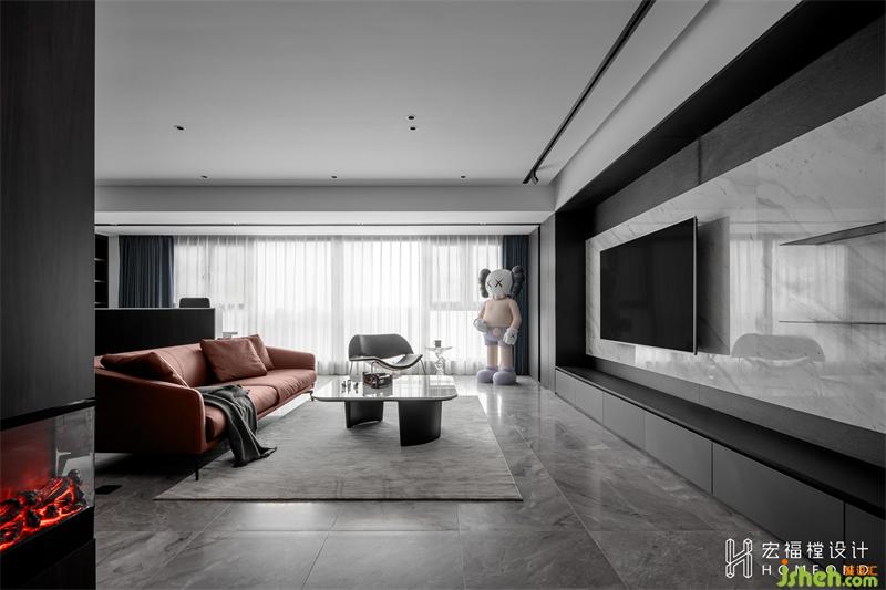 整体采用柔光云灰色地砖进行铺贴,让公共区域简洁有力的同时更有高级感。4690mm长度的电视墙拉伸了整个空间的横向感,大理石材质与黑色护墙板进行叠层搭配,用基础的线面组合释放无限的空间思维,在视野上延伸宽度与深邃感,底部的收纳柜放置屋主未开封的手办使用。