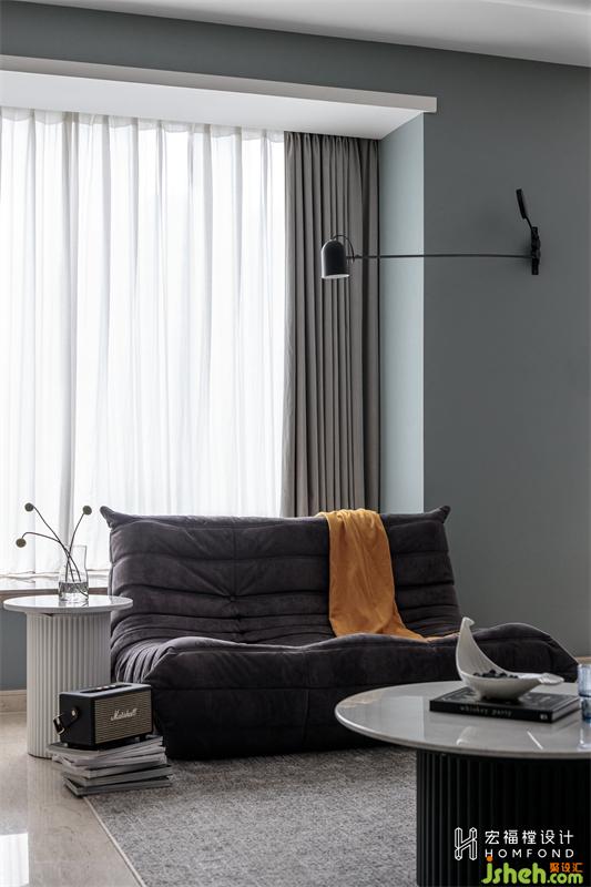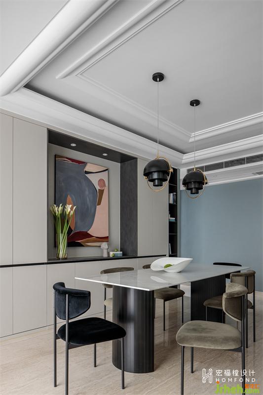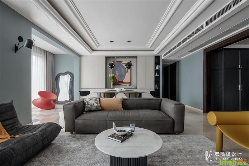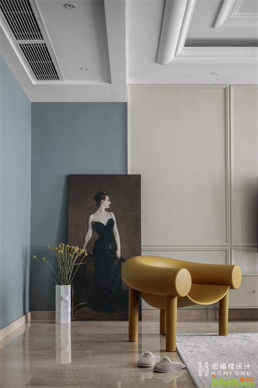 家居设计保留原始吊顶的石膏线条及地面瓷砖,拆除电视墙,重刷乳胶漆,是将女屋主喜爱的灰、蓝、绿进行中和后调配制成。阳台纳入客厅区域,增加空间亮度,让精装房在视觉上显得更为清爽。轻快明媚的色彩及充满艺术气质的挂画、沙发、凳椅被拆分重新组合到空间中,表现出一种令人难以忽视的美感。