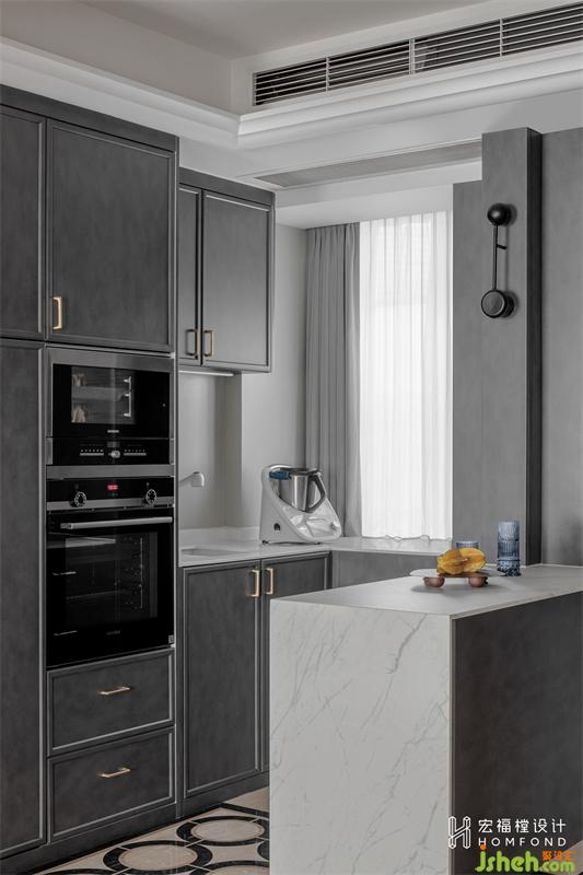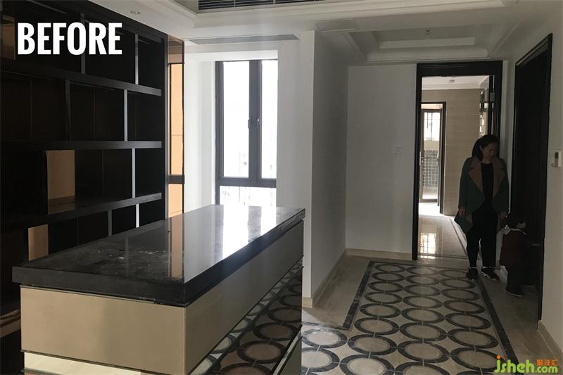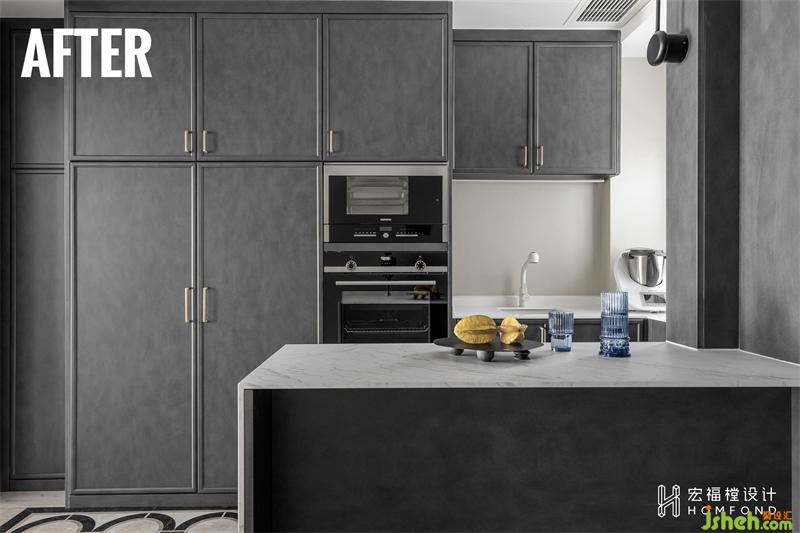 原始玄关为酒柜+吧台,颜色深沉,完全与屋主生活习惯及气质不符。我们将其拆除后改造为3250mm+580mmL型储物空间+西厨,再根据女屋主身高打造长1200mmx宽600mmx高880mm的岛台,方便她平日里为女儿烘焙蛋糕,准备水果使用。岛台右侧增添1980mmx380mm的鞋柜,满足家人的鞋类放置。区域色彩改变为灰色调,通过材质与纹理的变化营造优雅而富有质感的空间氛围。