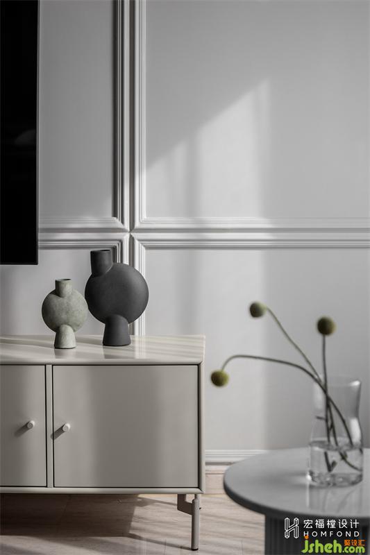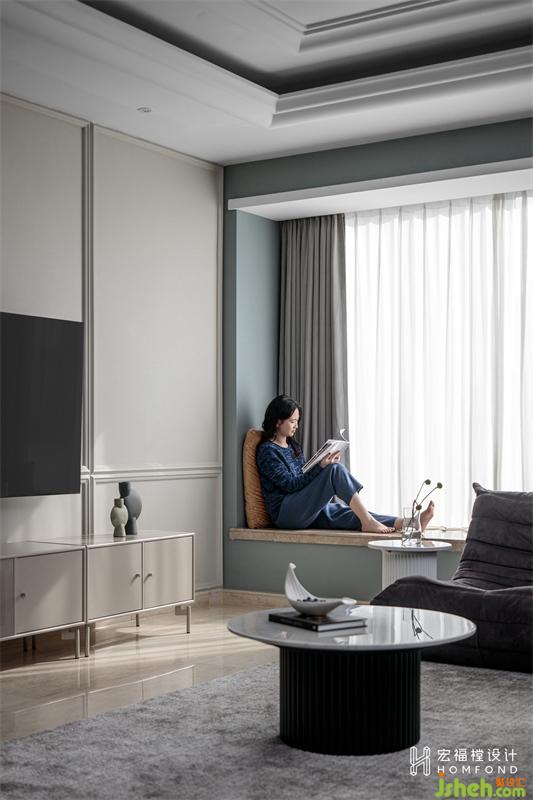 电视墙双拼两圈45mm石膏线,迸发的力量感与原始顶面线条进行融合。米色与其他色调完美融合,为空间带来天然的优雅魅力。天气好的时候,客厅的飘窗区域就会被阳光洒满,女屋主常常会在此喝茶、看书,这种放松自在的状态是她为自己营造的纯粹世界。
