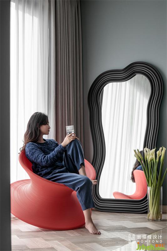 阳台纳入后与餐厅空间融合,运用客厅墙面的乳胶漆将其简单的区分。胭脂红陀螺椅子成为这个区域的点睛之笔,造型活泼,是夫妻为女儿和自己营造的生活趣味。