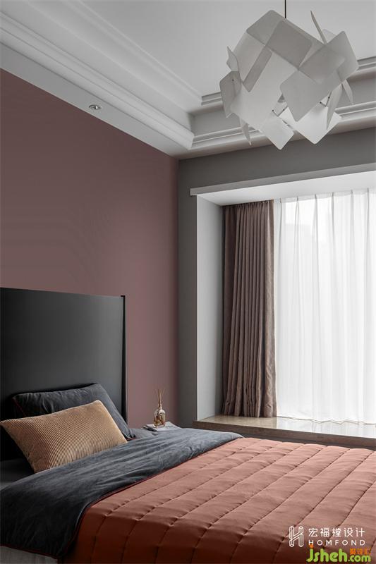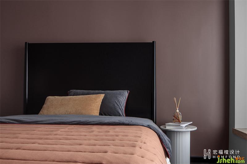 次卧是预留给父母偶尔探访使用,整体色调以绛紫色呈现,优雅深邃的同时饱含浪漫的情韵。