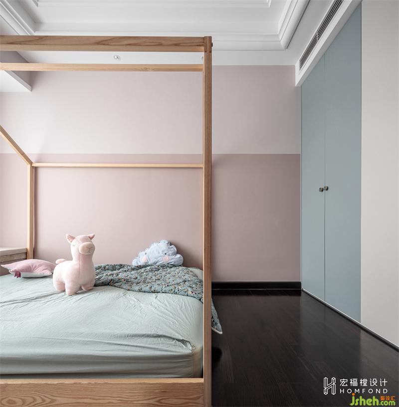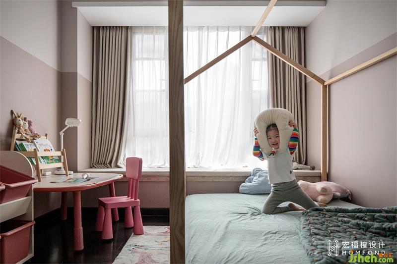 我们在儿童房的构思上花费了很多心思,女儿今年三岁,一个可变性较强且同时富有趣味的空间对她的成长非常重要。首先我们将墙面做了分色处理,裸粉碰撞蜜桃色,优美动人又集少女气质的可爱单纯与娇嫩细腻。再搭配可爱造型的木屋床,仿佛整个世界都能被这份美满包围。