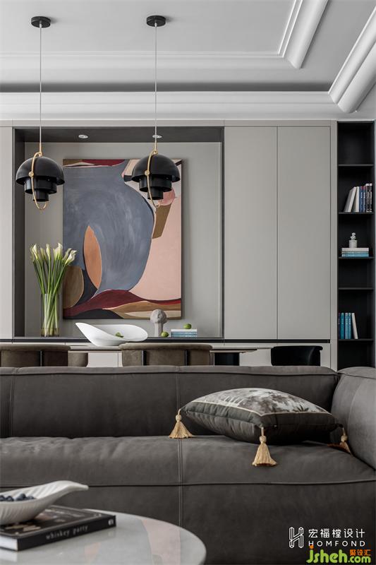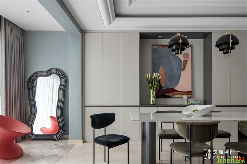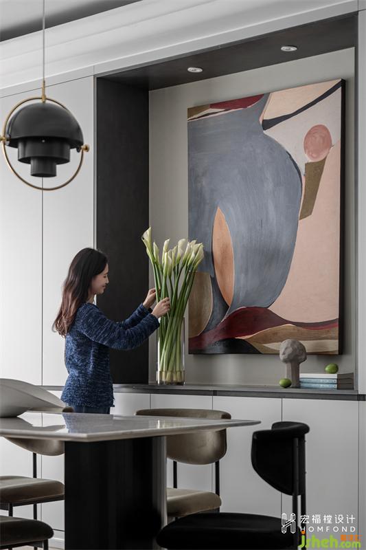 原始餐厅墙无装饰设计,我们将其改为4190mmx400mm的餐边柜,上下两层,储物空间充裕。曼妙感极强的抽象艺术油画、女屋主精心打理的鲜花、极简云石桌、现代翻转圆球吊灯,空间气氛通过巧妙安排相互协调,营造出柔美而现代感极强的装饰效果。