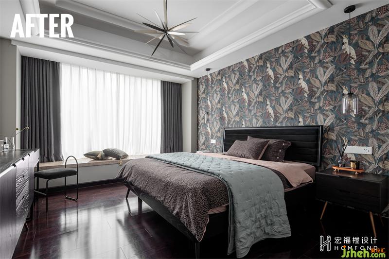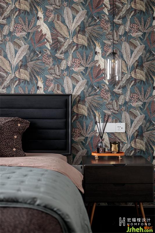 拆除原始主卧背景墙后整面铺贴墙布,图案以摩洛哥蓝与温柔米色相互交错,复古而典雅的色调很好地把控着空间的气氛与节奏,带着几分神秘与深沉,散发着宁静安然的自然力量。