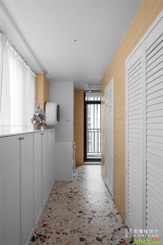 家居设计将生活阳台彻底的利用起来,划分为两个区域,储物+阳台。左侧靠窗位置设计3530mmx600mm的柜子,放置生活杂物,右侧则隔成了女儿的衣帽间+大件杂物间。因为空间非常明亮通透,配以白色乳胶漆混搭赭黄色瓷砖,阳光透过纱帘映照在百叶窗上时,惬意的氛围撩拨着身心与视感。