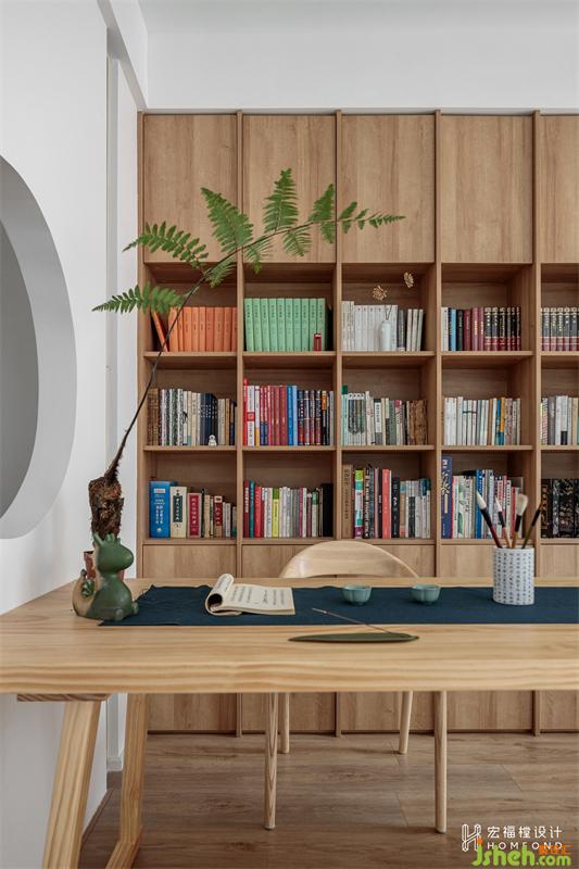 二人平日里喜爱阅读,所以定制了一面2800mm长度的书柜墙。女主人给每一格空间都做了清晰的分类,中国古诗词、世界名著、现代小说、人物传记、艺术画册以及夫妻俩的专业书籍等等,呈现出舒适美感的同时又方便检索。在满足书房功能后,给予了一部分空间给相邻的猫舍使用,同样以玻璃材质进行区域分隔,流通的光线在视觉上似分而连。