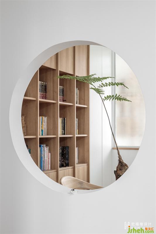 电梯到达7楼,打开大门正面迎来的便是将空间退移1060mm后呈现的圆形端景。景中摆放的金毛狗蕨,在阳光极佳的环境中,显得特别有精神。这种悠然的环境令人放松和欣喜,也进一步反应出了“拾壹”家自然惬意的个性。