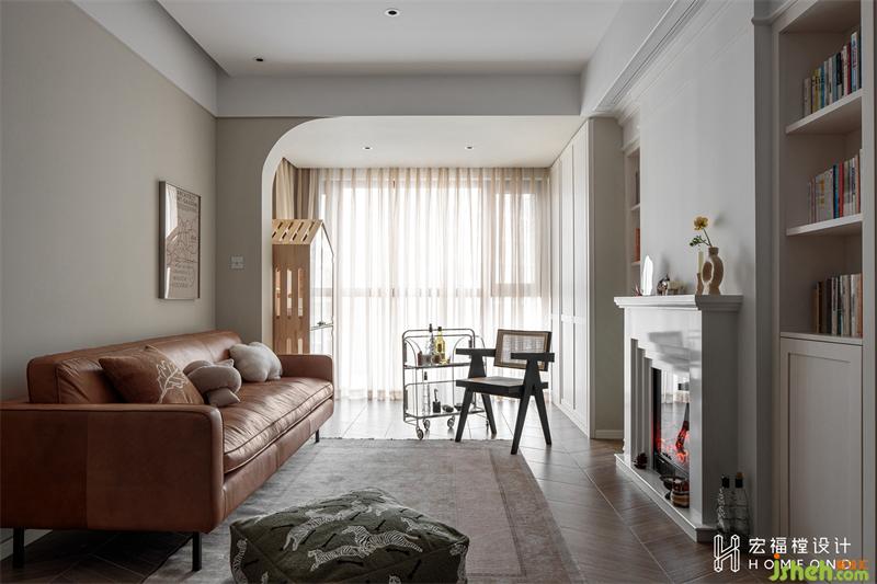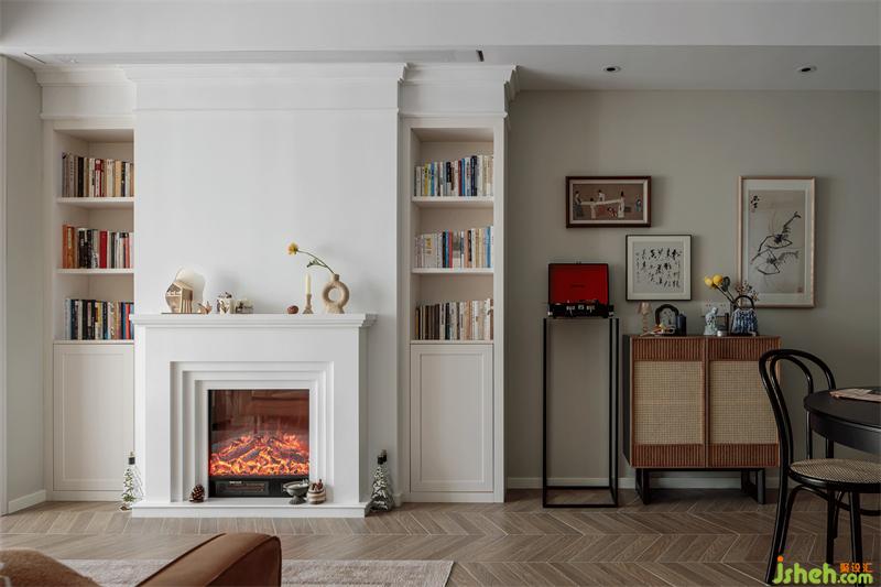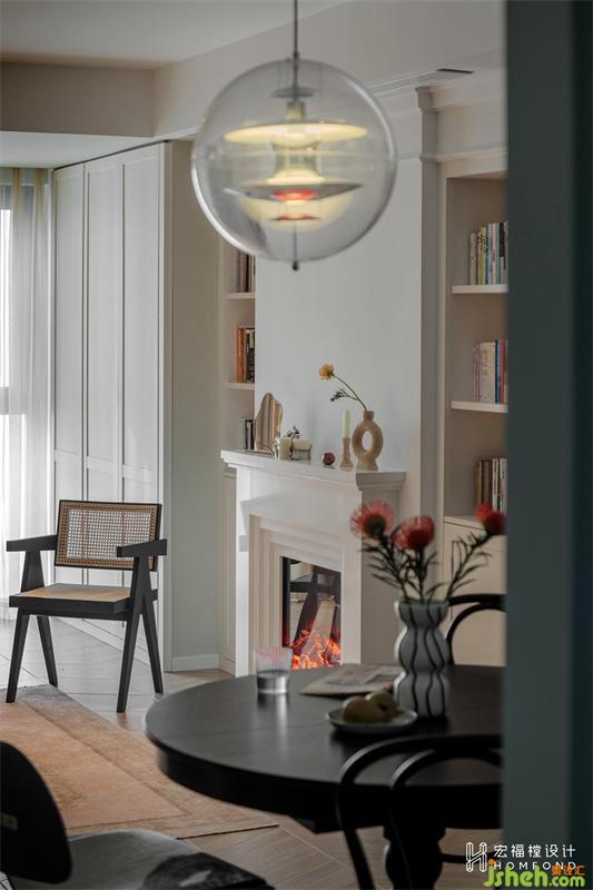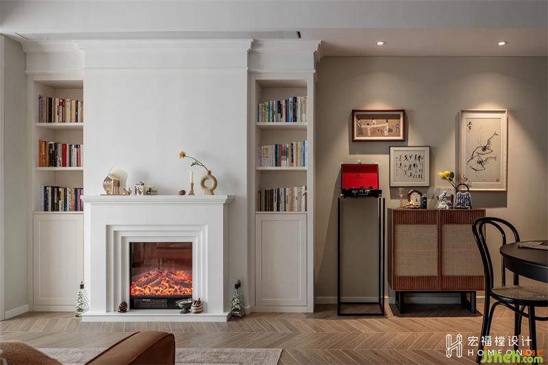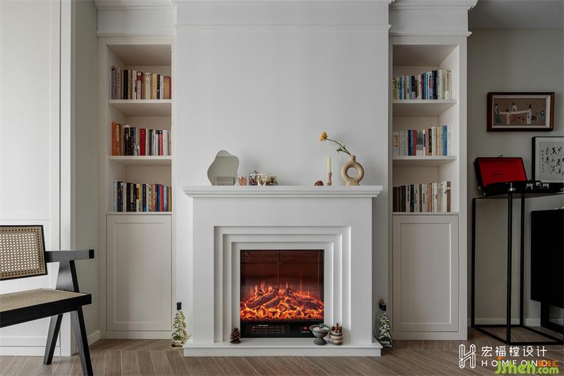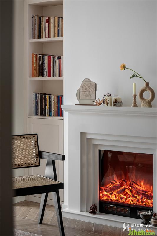 在他们看过的很多电影里,日常或是过节的时候,三五好友围坐在壁炉前烤着火、喝着酒、听着音乐、聊着天,是多么令人向往的画面。因为房屋结构限制,将它设计为新古典石膏叠级造型,以装饰性进行呈现。