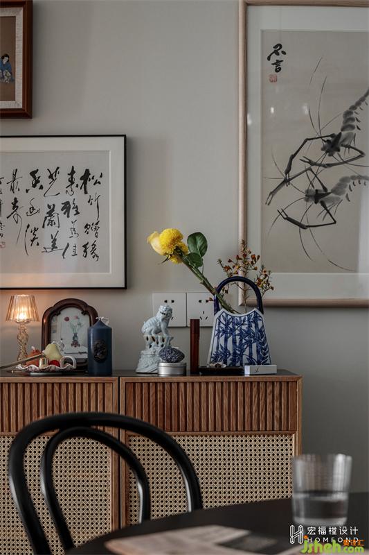 男屋主十分喜爱书画、音乐及陶瓷制品。黑胶唱机、清代王成勋的绢画、富有田园趣味的墨画,这些物品被恰到好处地混搭起来。闲暇时,找出一张喜欢的唱片,慢慢放下唱针,是他们珍视的放松时间。