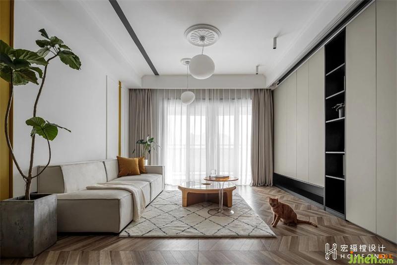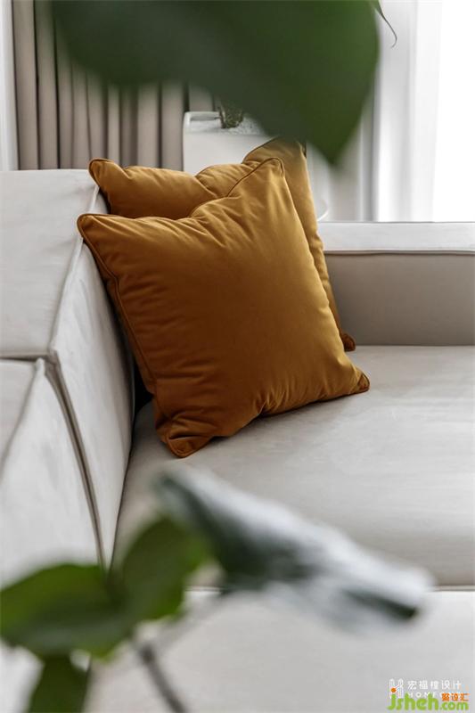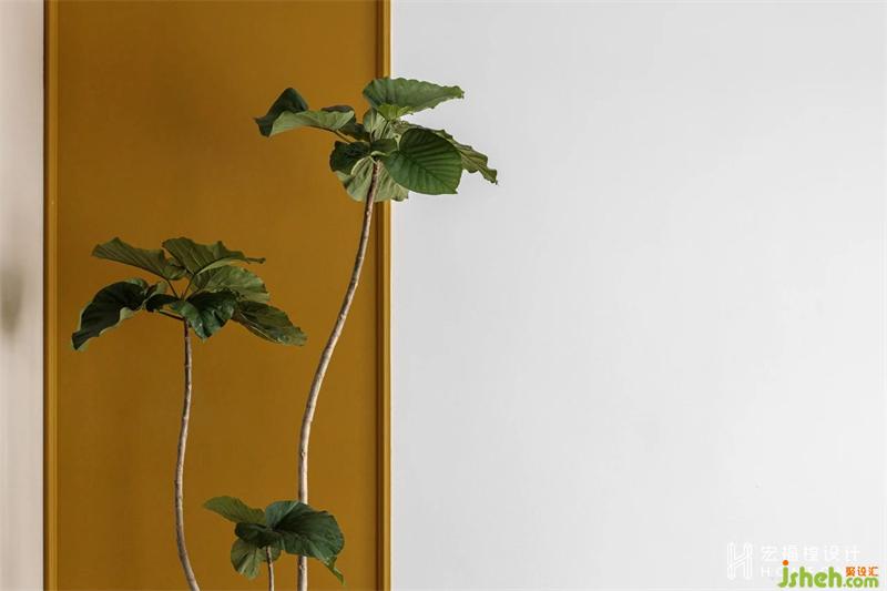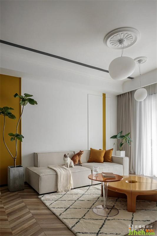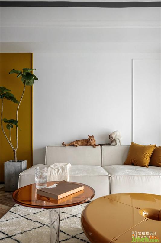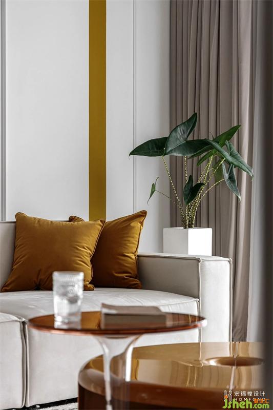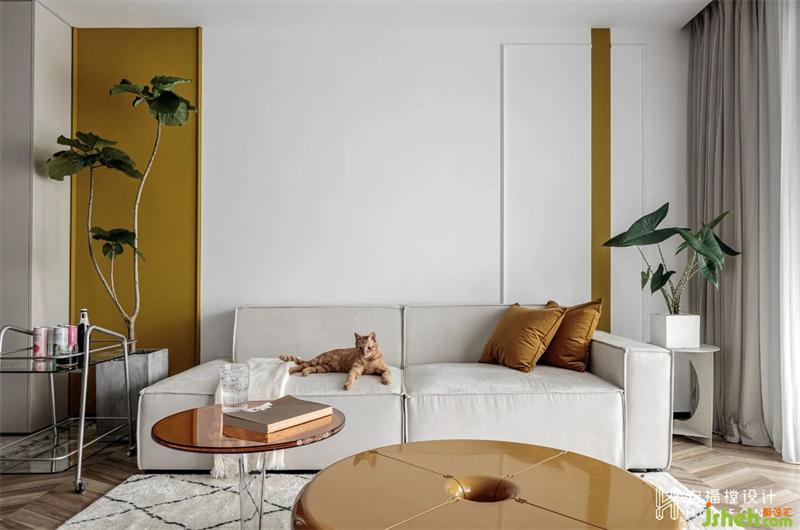 左框以分割设计手法来强调墙面存在感,右框以传统欧式石膏线作为分割,再以线作为串联。芥末黄作为背景色进行填充,沙发、边几则无需过多的装饰便可以达到高级而艺术的效果。烧橙色亚克力咖啡桌的加入,客厅空间获得了完美的对比度。