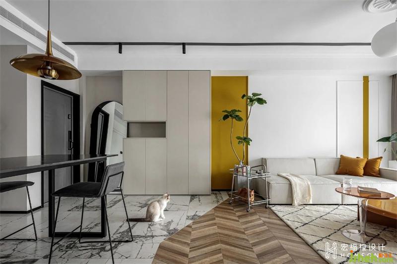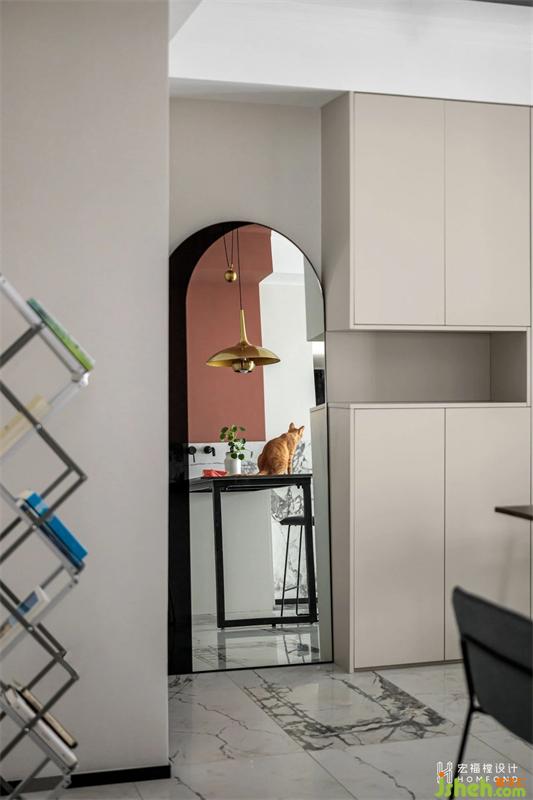 入户加入1600*350mm收纳柜,同严肃神秘的黑框镜面与暖灰柜面碰撞,产生一系列的情感反差。地面进行斜面分割,异形鱼骨拼木纹砖交错寒江雪大理石地砖,张弛有度,彰显活力个性的同时让整体空间更富有艺术感。