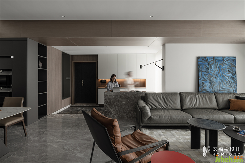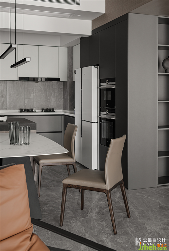 经由逻辑设计的色彩配搭,更更容易把控整体调性。第一层,暖灰亮面砖过渡到鲸鱼灰石材串联至上恢复暖白天花;第二层,鲸鱼灰地柜过渡到象牙白吊柜;第三层,黑白灰家具为主,点缀浅灰褐,尽显优雅、精致的空间质感。