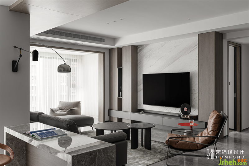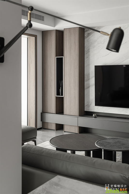 电视墙通过“粗细线条”横竖向切分形成色块把两侧空间变得很碎,而中间空间则设计为一个整体显得很粗。粗粗细细的线条交叉感,赋予空间形态更多可能性。