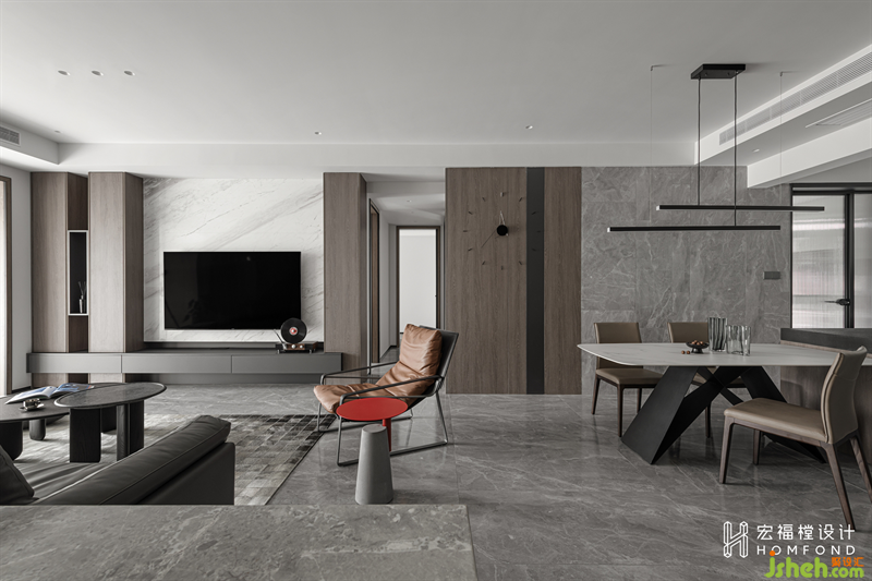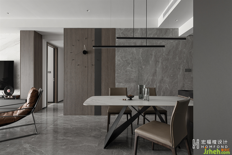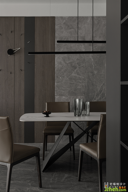 客餐厅与悬挂位于同一空间,给人通透的视觉感受,保证空间的整体和谐。装修设计大理石纹路和木制结合,相近的色调带来轻松舒适感。