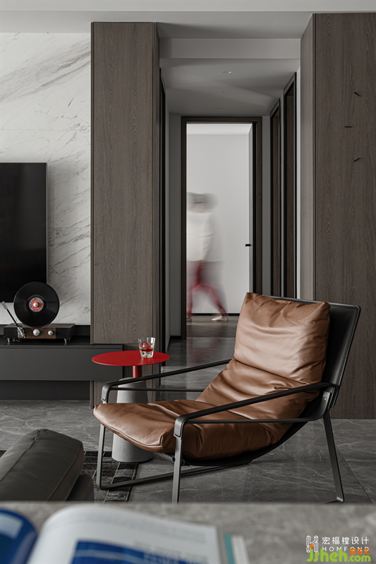 客厅的陈设打破寻常。谁也想不到,郎窑红边几用作空间点缀,这个颜色是多少设计师避之不及的。出乎意料的是,郎窑红配铁锈棕,烘托出别样出挑的轻奢氛围。