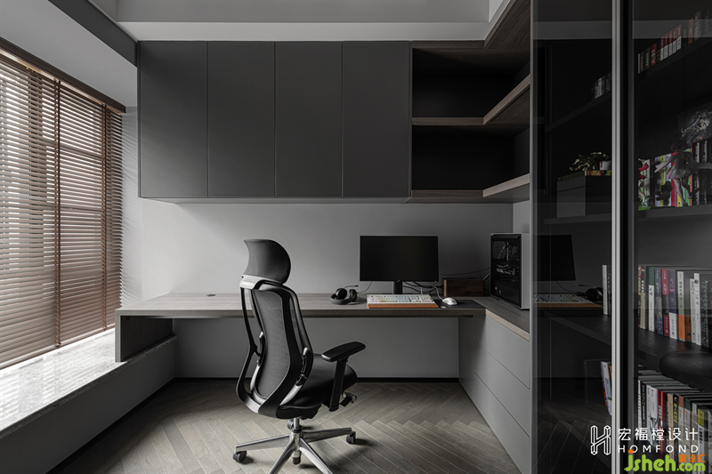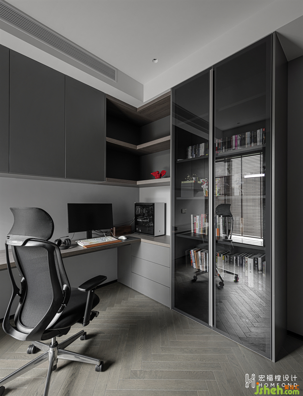书房整体大气时尚,体现了屋主沉稳、不拘一格的气质品味。细长型的结构中,打造出一个两层夹角收纳区域恰好能满足屋主居住日常的使用需求。