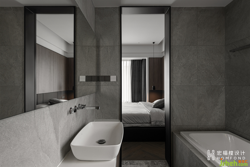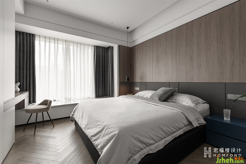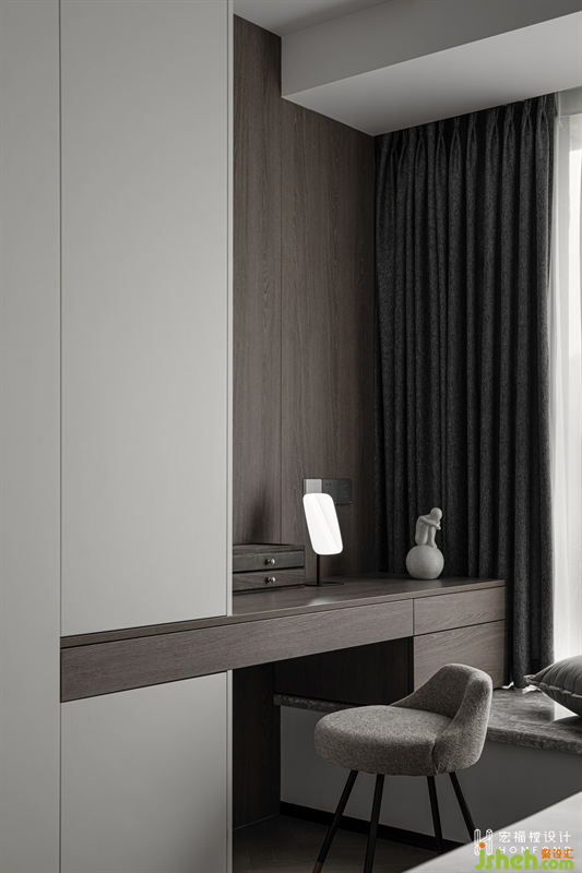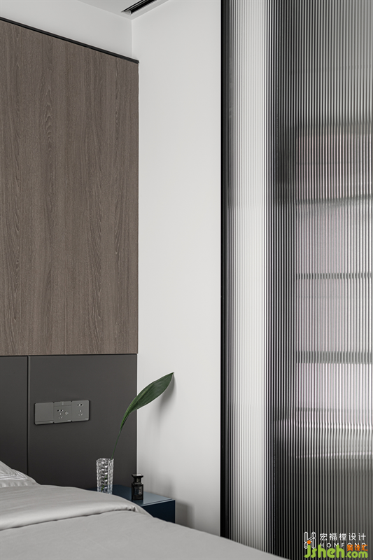 主卧的线条和装饰极为考究,L型墙板+鲸鱼灰皮质硬包,呈现出与居者一致的审美情绪和生活哲学。妆台沿用电视墙一致的设计手法,粗细线条材质糅合穿插,始终维持形态统一的氛围感。