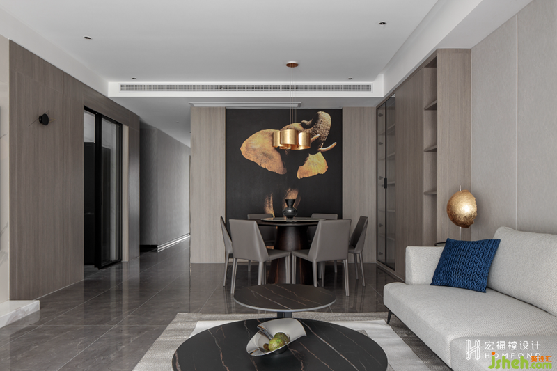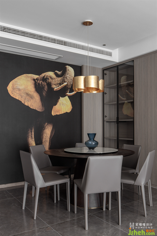 餐桌以聚合的圆形呈现,家人们围合而坐,没有棱角,寓意一家人齐齐整整般和睦。充分利用可展示墙面,选择大胆的大象造型墙纸,形成戏剧张力。以独特的美学视角,奇妙的感官之旅为空间注入与大自然共生的天然关系。