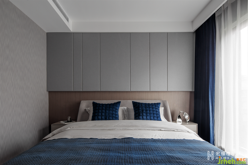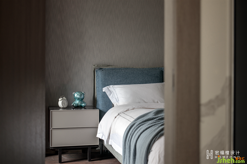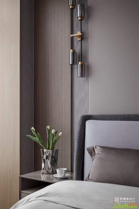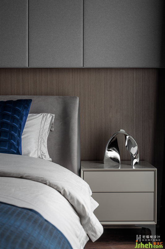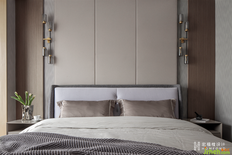 夫妻工作较忙,对于睡眠区域更注重宁静及舒适。延续客厅的硬包造型,以柔和沉浸的烟灰为主色调,提供舒缓的抚慰作用。并加入天然木饰面,为空间注入镇定和恢复的力量源泉。