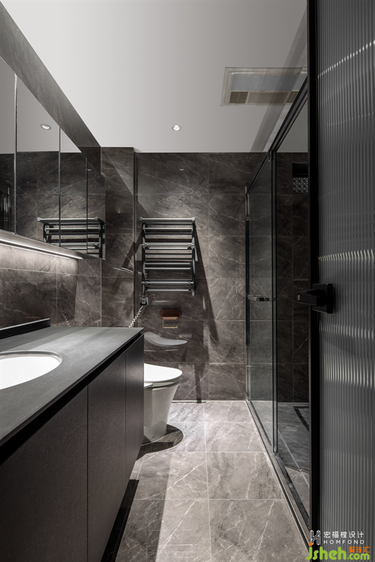与公共空间相比,较为私人的主卧卫生间氛围变得更沉稳大气,让空间演绎出男屋主为一家人付出的的刚毅和坚定。