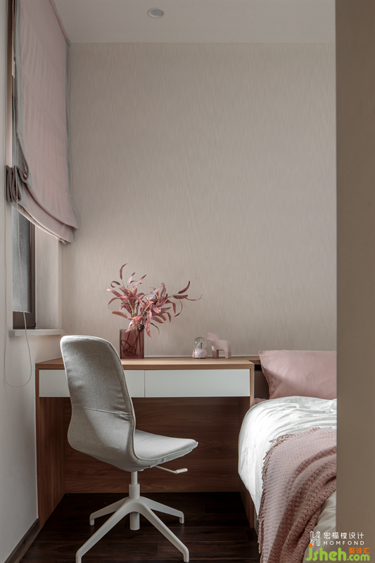 儿子的房间是利用原始餐厅与部分阳台合并而来,从电视墙左侧进入,隐形于墙内。因有足够的面积使用,所以空间除了睡眠区,也加入了学习空间。