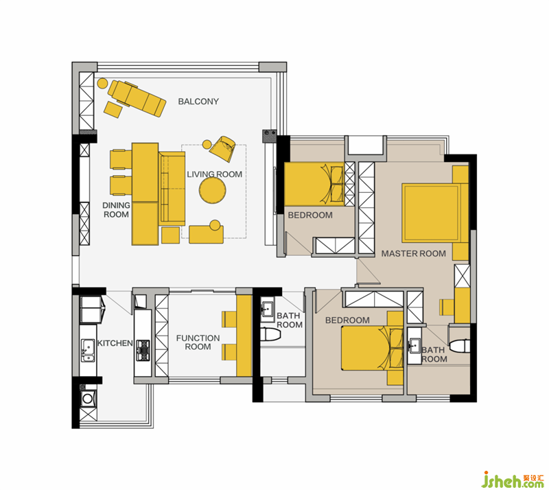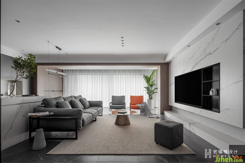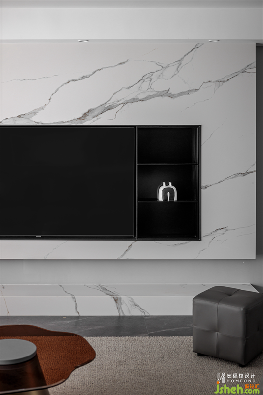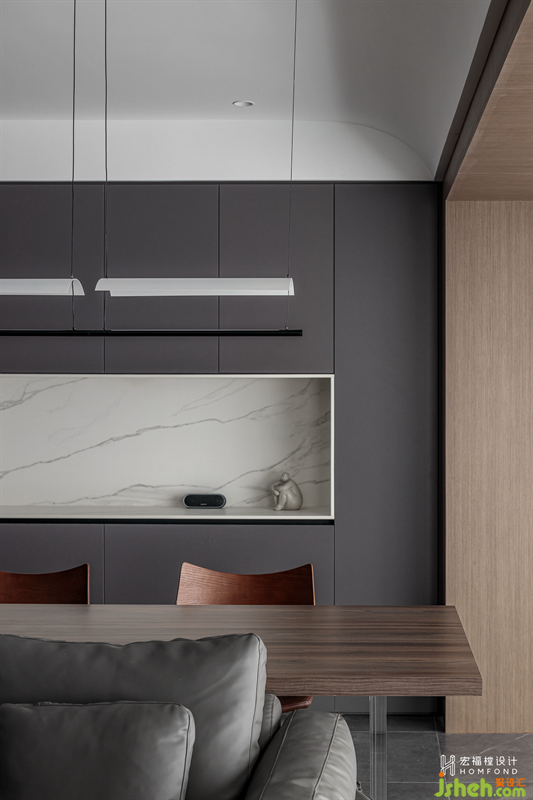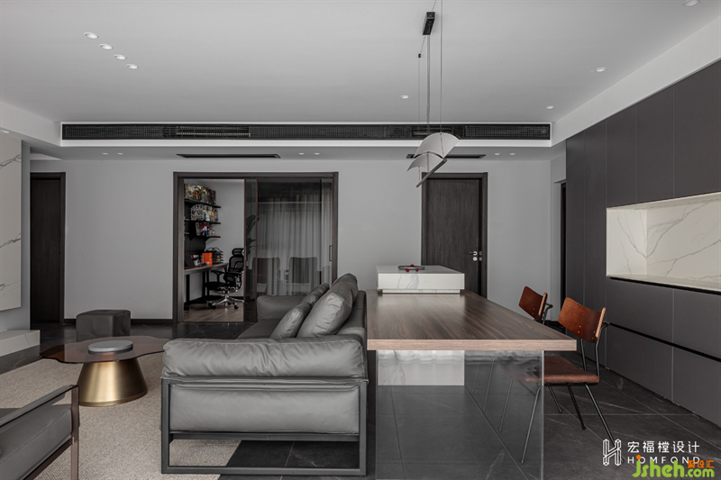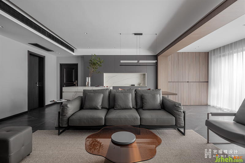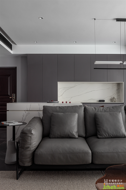 家居设计使用更经久耐用的岩板、真皮、大理石材质凸显品质与魅力,60%的灰色+30%黑色+10%白色(6:3:1的黄金比例),让整个空间的配色更协调。