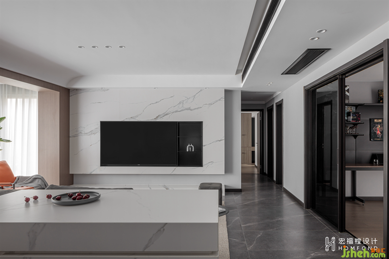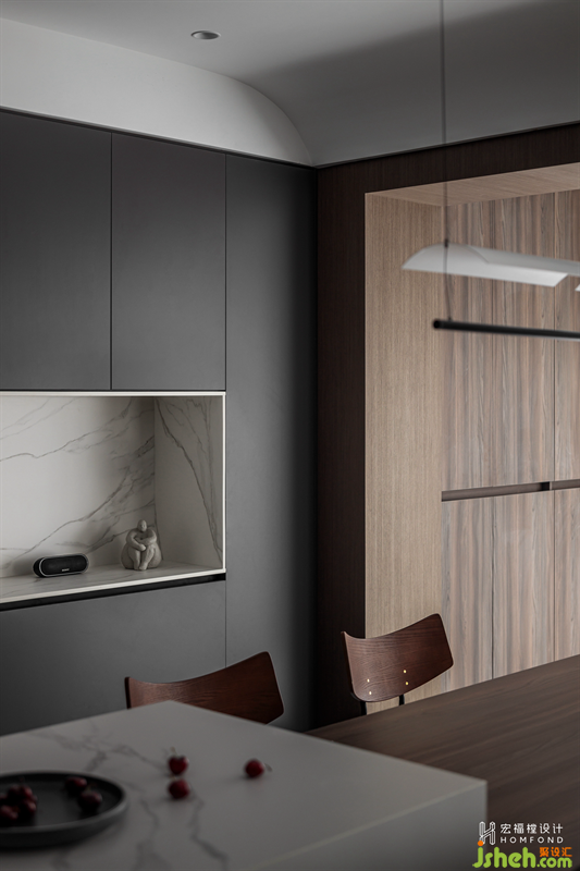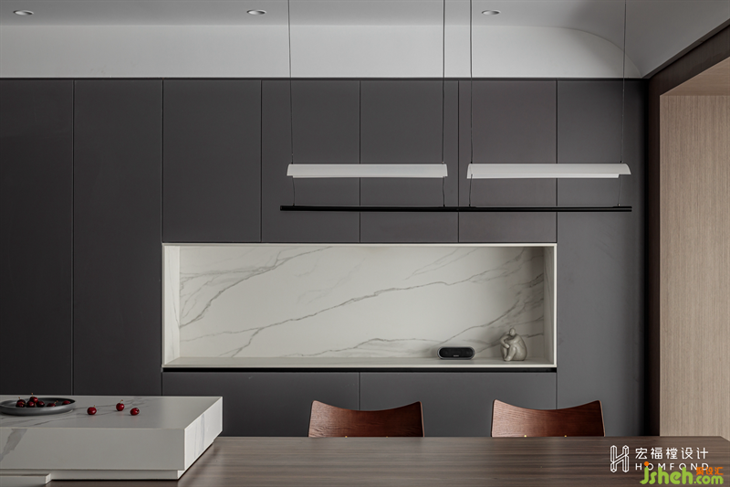 扩大后的客餐厅视觉平坦开阔,流通与互动一体成型。电视墙、岛台以及阳台区域使用不同的材质勾勒,凸显出近、中、远景层次。