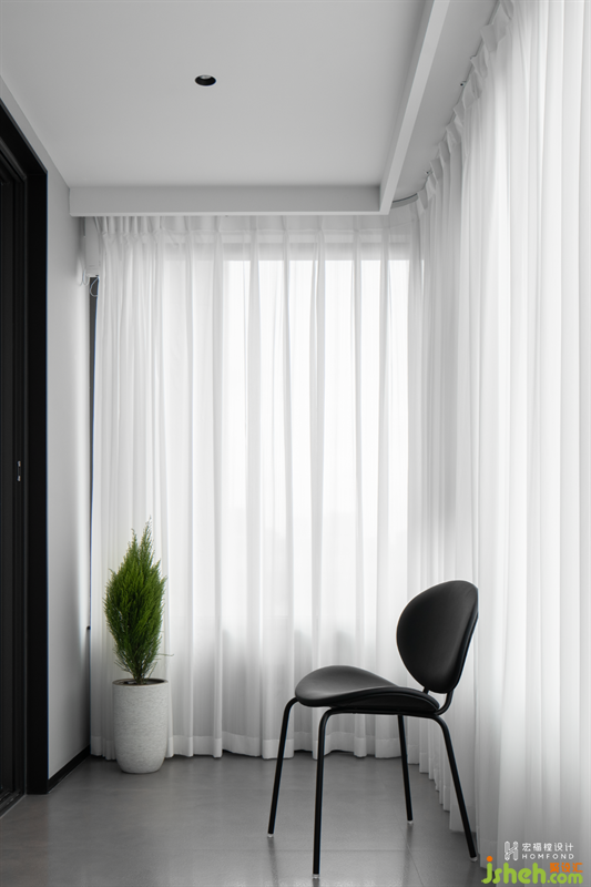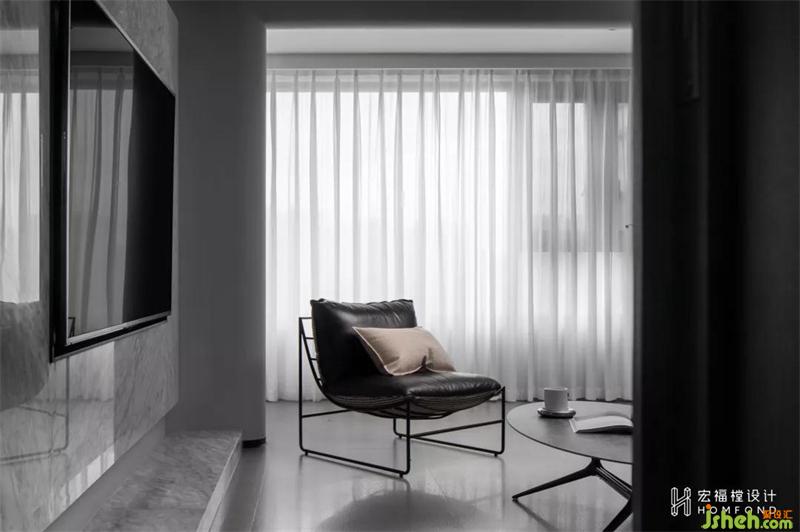 纱帘的透光性,能将光线过滤之后柔和地引入空间中,而大面积的落地窗模糊掉内外的边界感。在白天时,光影会根据外部的天气变化进行转变,让居住者体验到自然而舒适的真实环境。