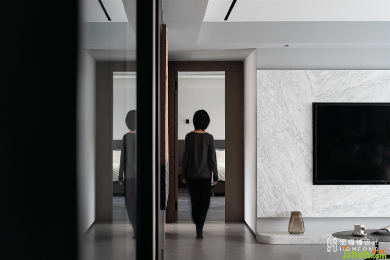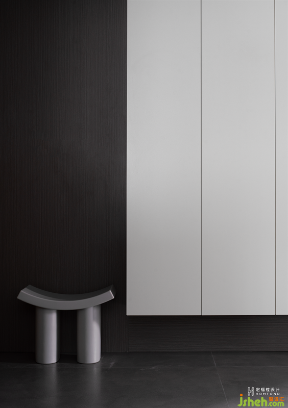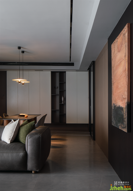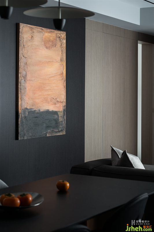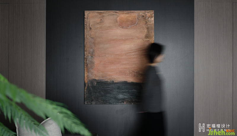 作为公共空间中的缓冲地带,走廊以延展视觉和氛围呈现。一幅抽象手绘画,与背景木皮材质糅杂出多种感官体验。在游走与停留之间,具象与抽象进行多元叙述。