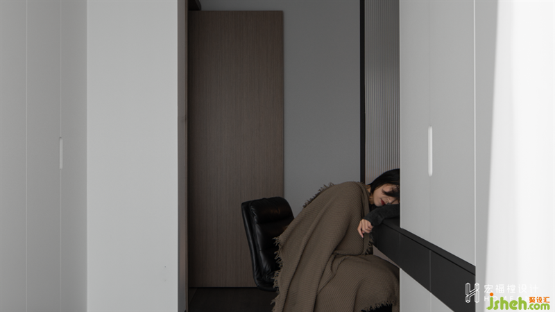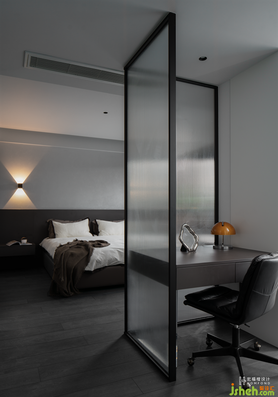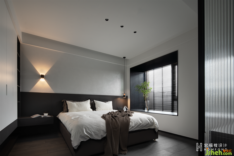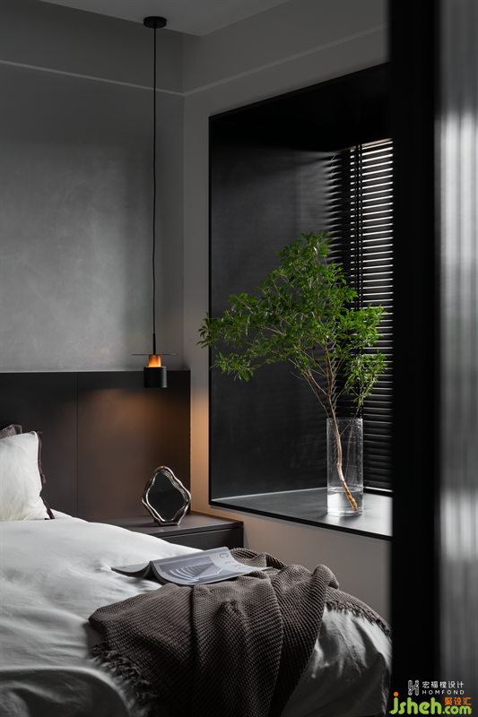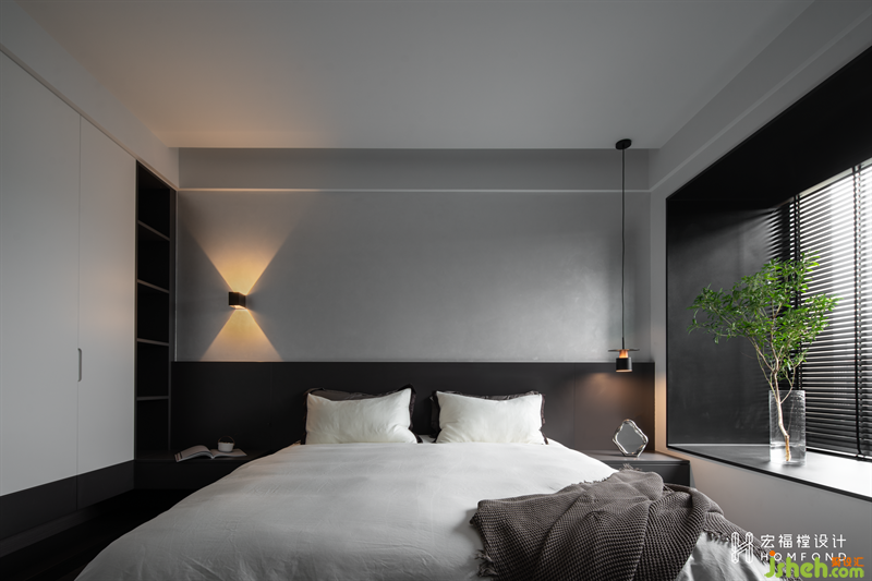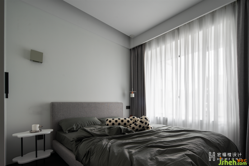 次卧室用作亲友探访时小住,不同种类的灰度为空间带来丰富的层次视觉,营造出淡雅平和的舒适氛围。