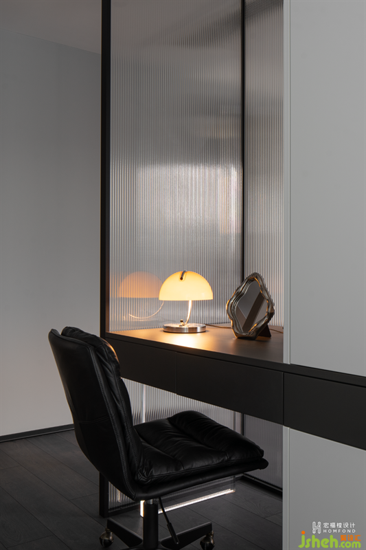 不同成形的光源相映成趣,模糊了硬朗与柔软的界限。衣帽间与睡眠区相隔的玻璃隔断强调空间的趣味、延伸感,并为其蕴含出包含生命力的对话空间。