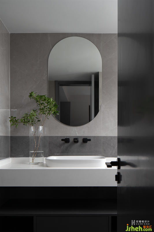 烟灰色、钢灰色、亮白色、魅影黑组合拼贴出清爽纯净的色块空间,镜面以椭圆造型弱化四边形过多而造成的硬朗感。多种元素融合呼应,得以焕发出新的能量。