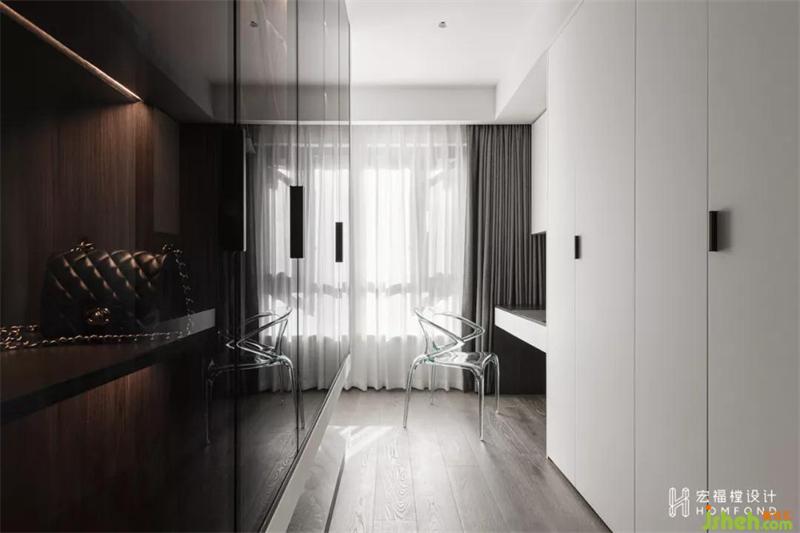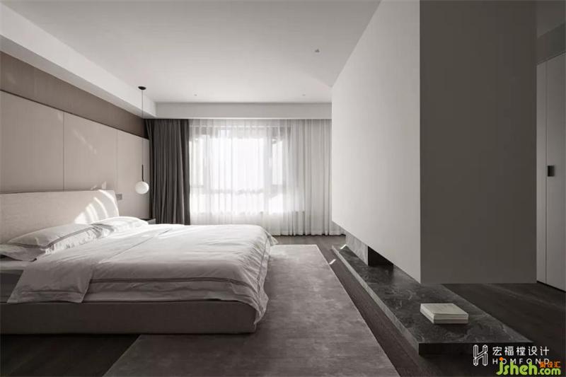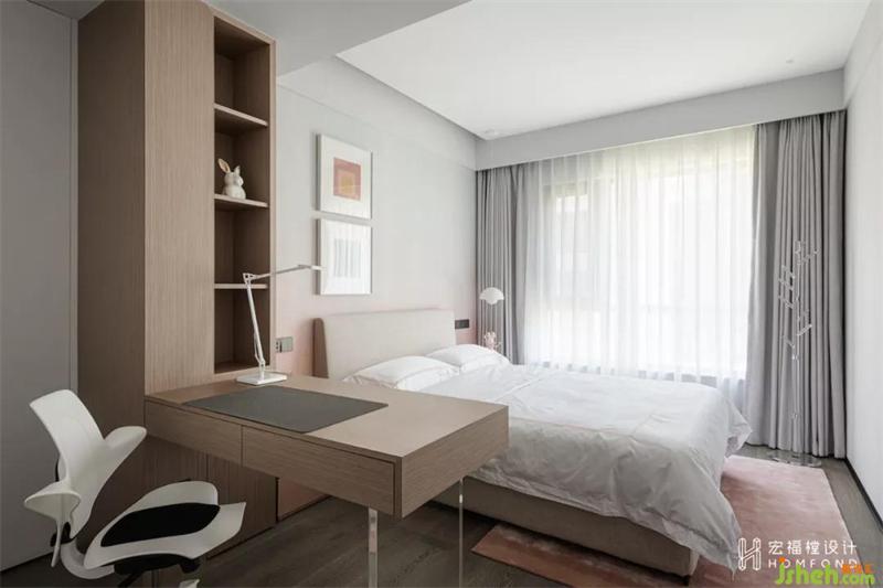 加入更丰富多元的空间体验以及游走其间的趣味性,通过细致把控墙体的重量,将电视墙体进行悬空。并利用足够的厚度将另一面设计为储物展示空间,提升卧室内部的互动及功能性。