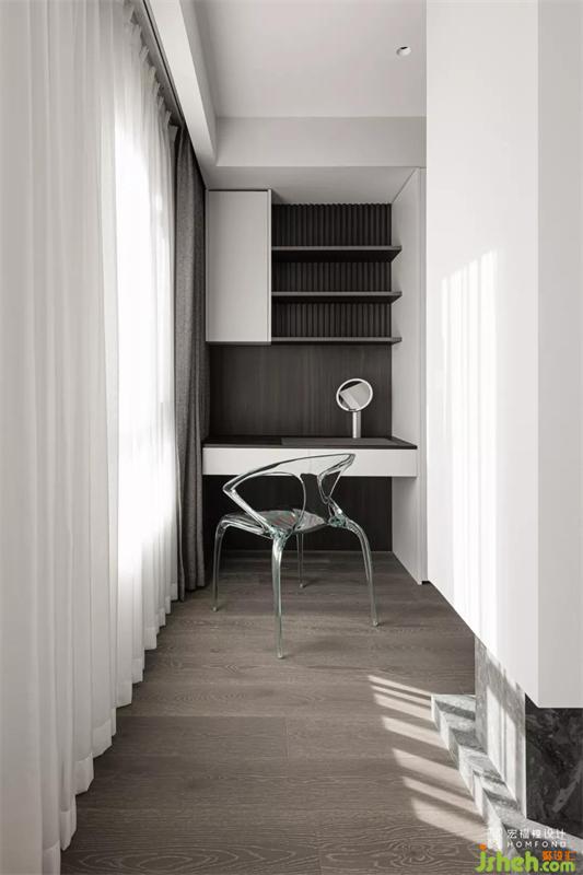 夫妻二人无论是选择家具或是衣物,统一都会选择更精简、经典的款式。对于家的功能思考,开放性与独立思考也同样重要,所以为其在6000mm长的落地窗带来的丰沛光线下,加入一处灵活办公区域。