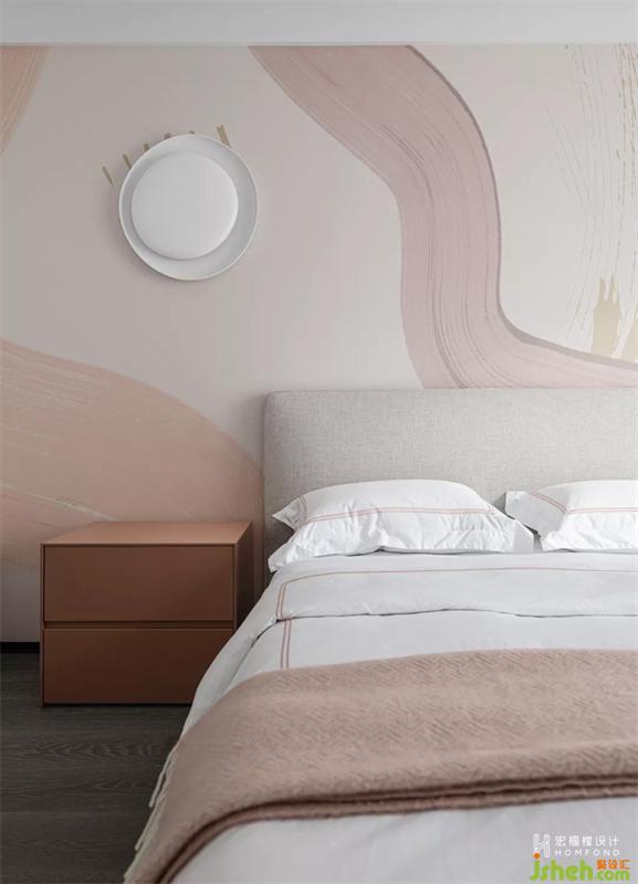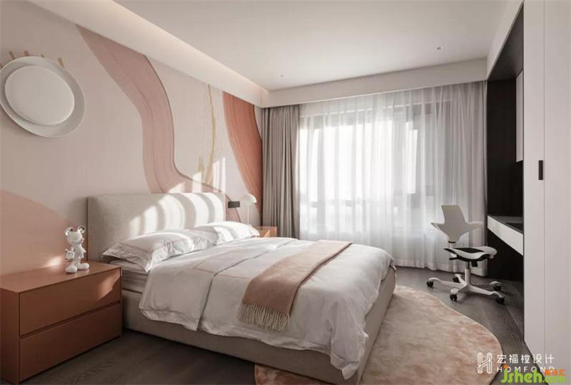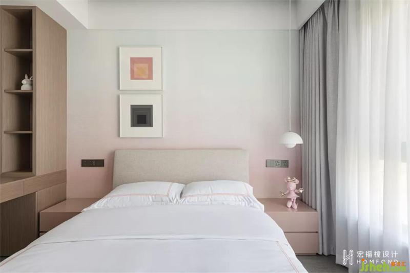 粉色依然作为另一间儿童房的基础色,柔性气质得以蔓延。取消卧室原本附带的卫生间,扩大面积,满足起居与学习功能,渐变的浪漫墙画,气氛轻盈通透,创造出超脱现实之外的梦幻与臆想。