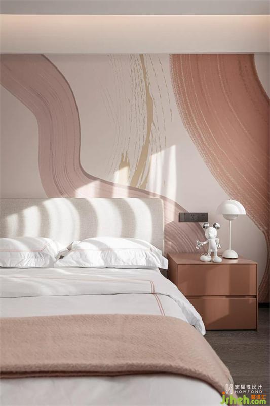 注重感官上的多样性,定制波浪形状墙画,塑造一片宁静的淡粉色绿洲,空间被赋予悦动与俏皮的情韵。从外引入的阳光在墙面产生戏剧性的变化效果,转变为动态下的流动美学,制造出快乐浪漫的趣味。