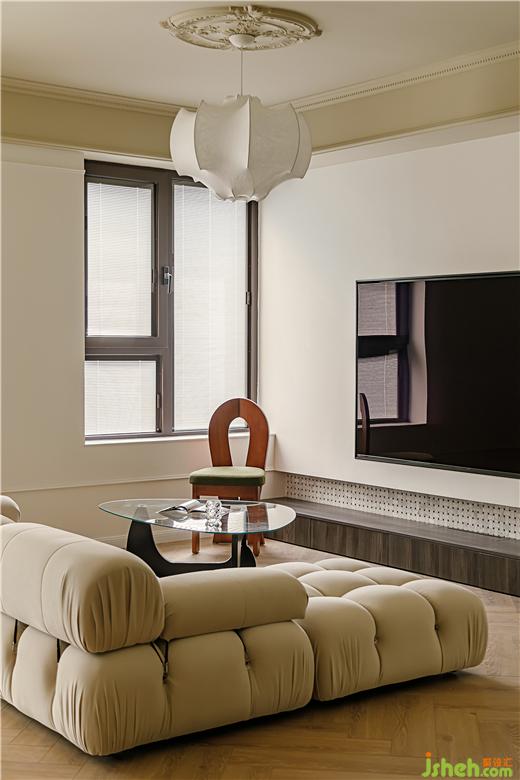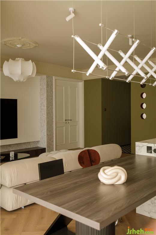 原始餐厅正对入户门,私密性和采光比较差,家装设计师将餐厅移到客厅区域,公用阳台采光,也能满足业主就餐看电视的娱乐功能;